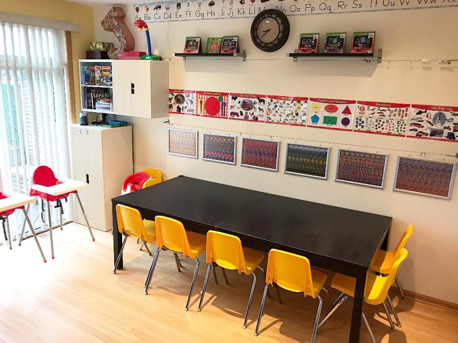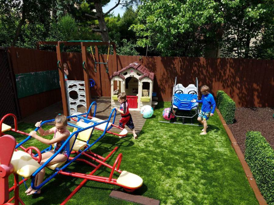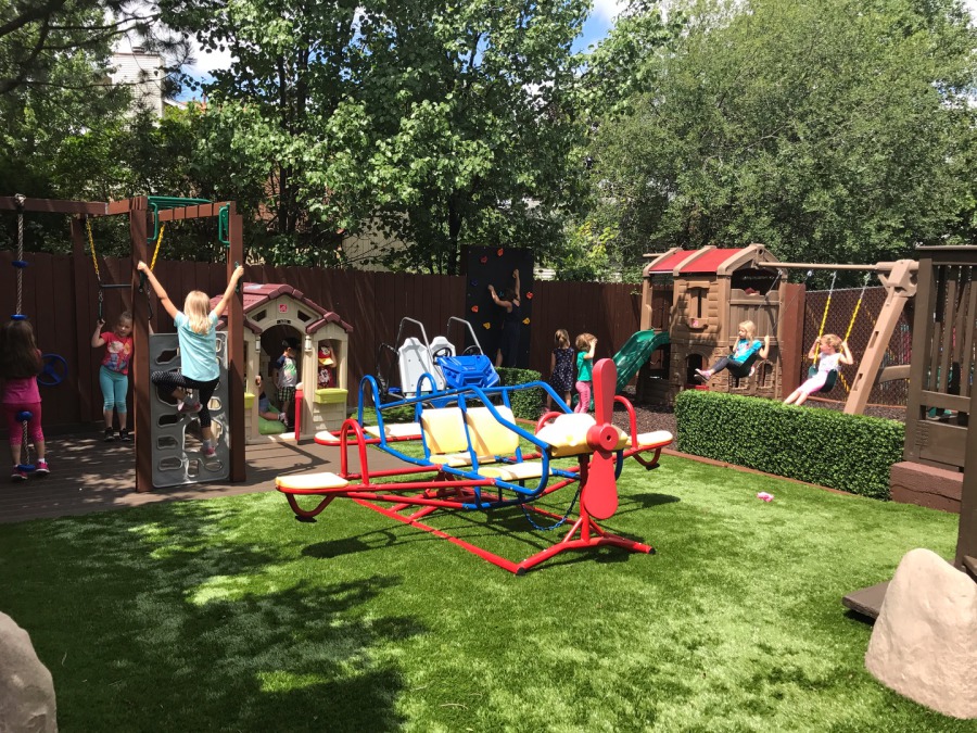 There are two outdoor areas that we use. The first one is our own backyard that was recently completely upgraded with new playset, water table, large chuck board, picnic tables and more. The second one is a public playground that is just across the street from our facility.